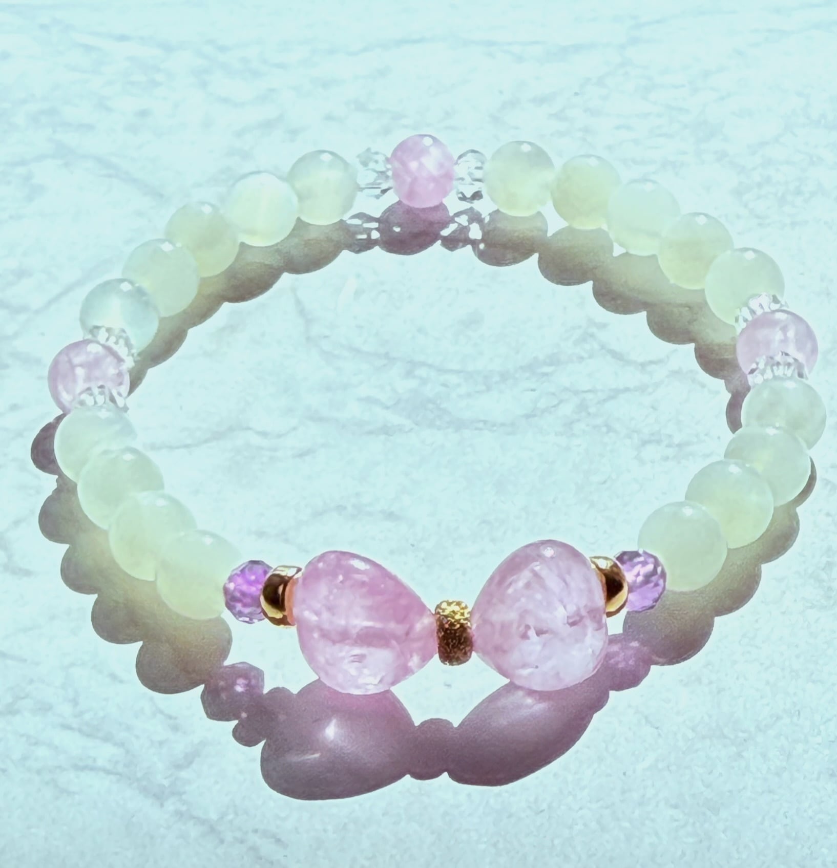 このクンツァイトとムーンストーンの組み合わせを「縁結び」モチーフのリボンにしたブレスにしました。
