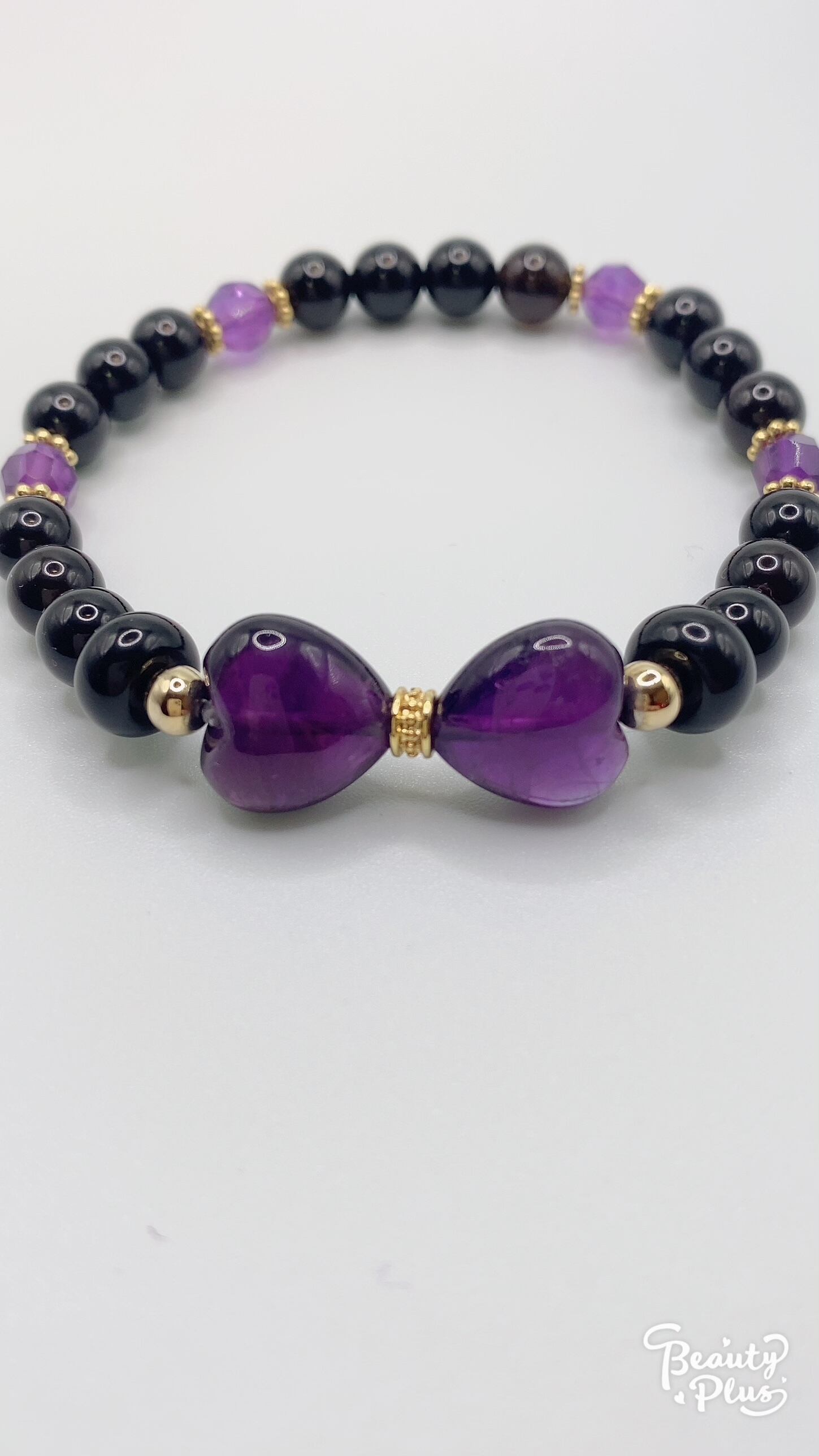 アメジストハート形をアレンジして可愛いリボンにしてオシャレにさりげなくマイナスエネルギーをブロック。