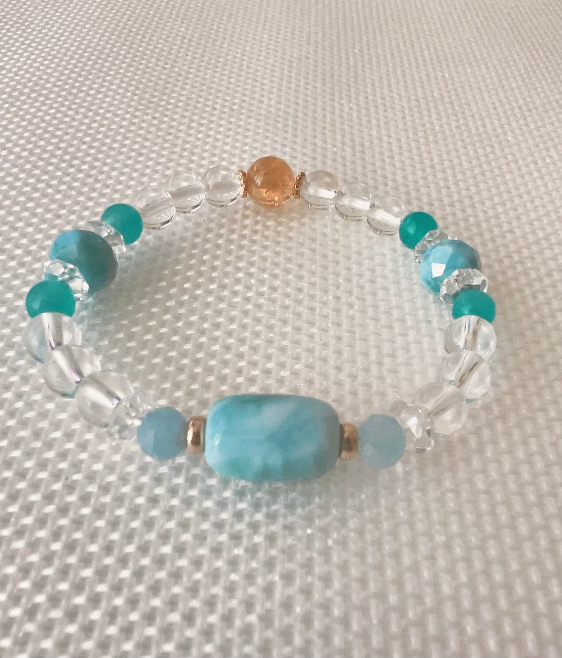 今回は、大粒のラリマーをメインに〝心身を健やかにするアマゾナイト〟〝気持ちを好奇心あふれて陽気にするシトリン〟〝愛情運アップのアクアマリン〟と組み合わせた欲張りブレスにしました。